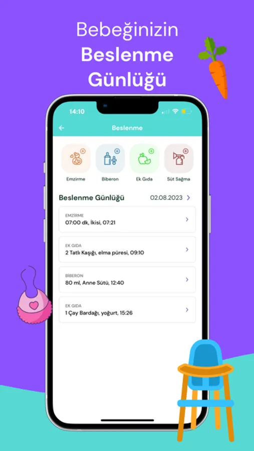 • Beslenme günlüğüne emzirme, ek gıda, biberonla beslenme, süt sağma bilgileri ekleme.