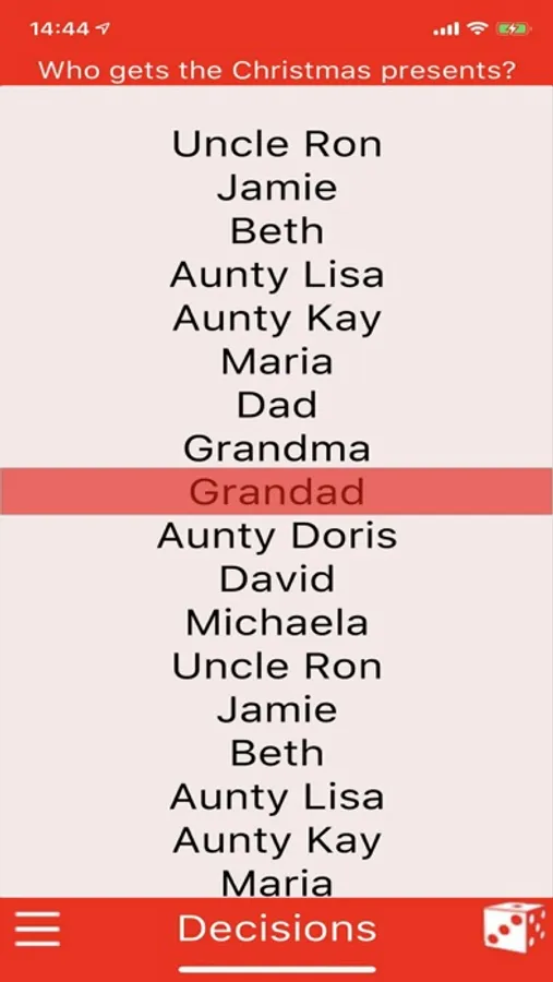 After a spin the list can be set to automatically remove the selected item. This is the case in the sample list which is Who gets the Christmas presents?