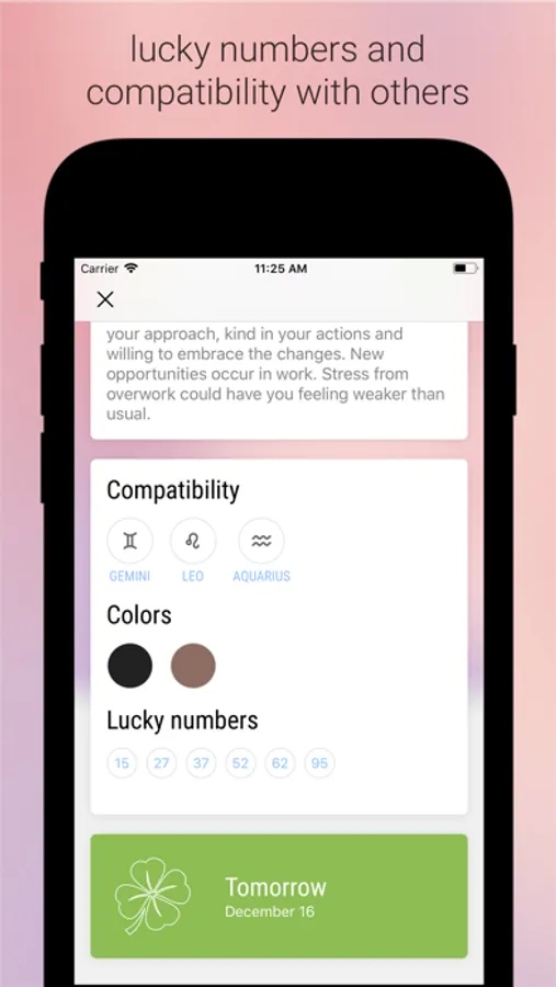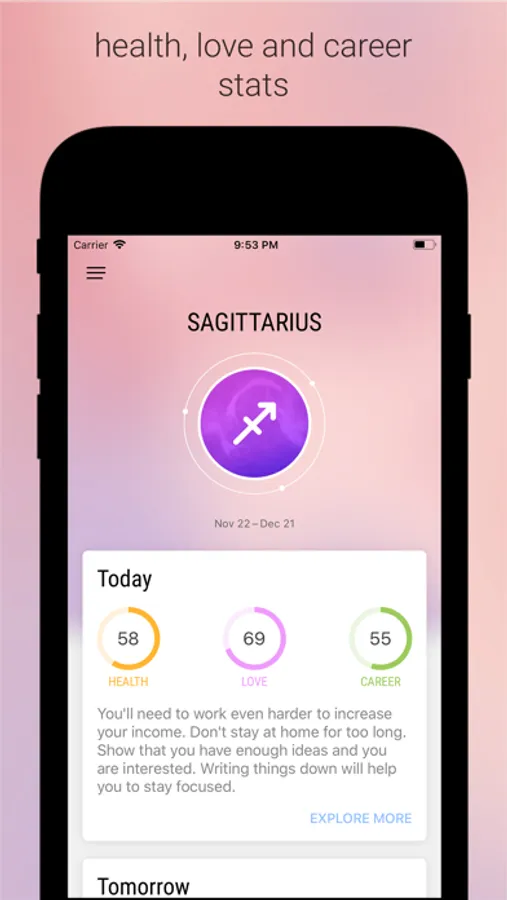 • Daily, weekly and monthly scores are available for health & wellness, love & dating, career & work. Always know when a good day is coming in your personal or professional life. And it is good to have a money forecast at hand.