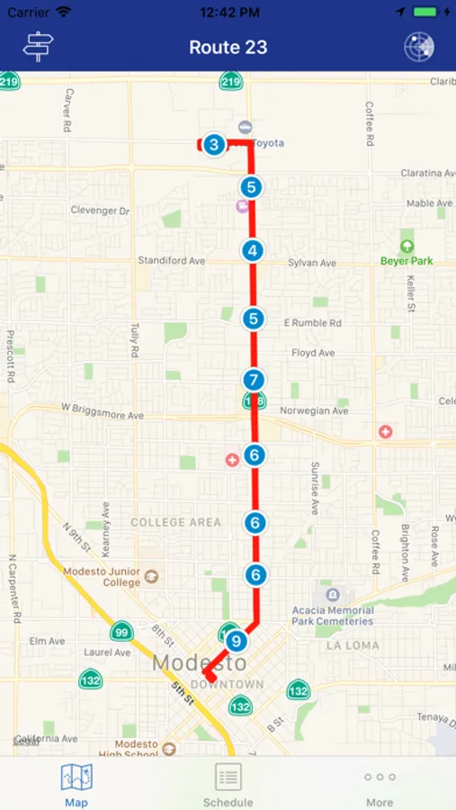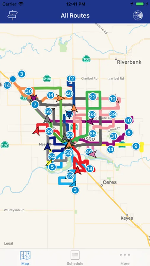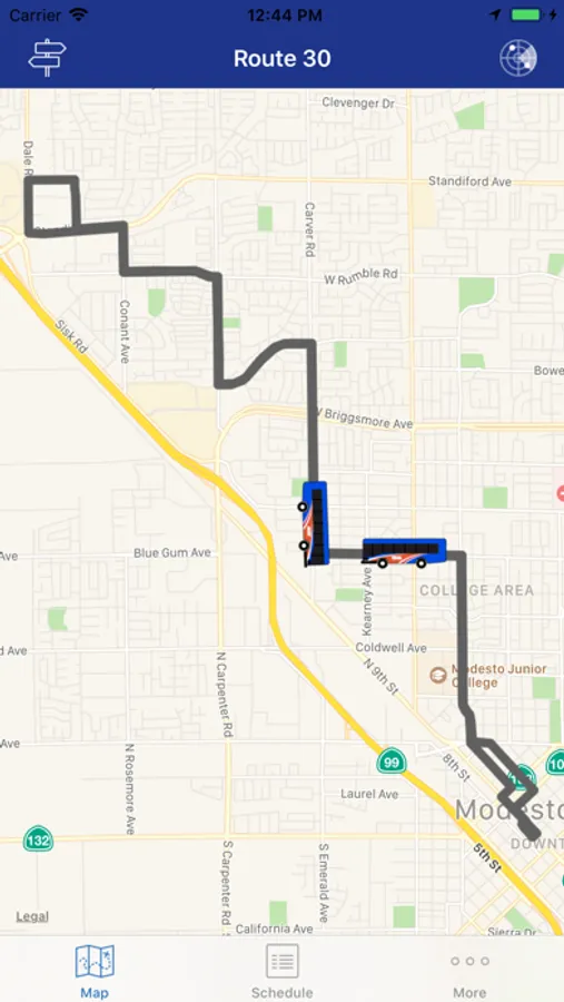 Bus route information for Modesto Area Express. This app displays real-time locations of buses with notifications and schedules.