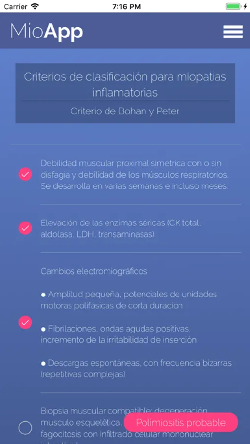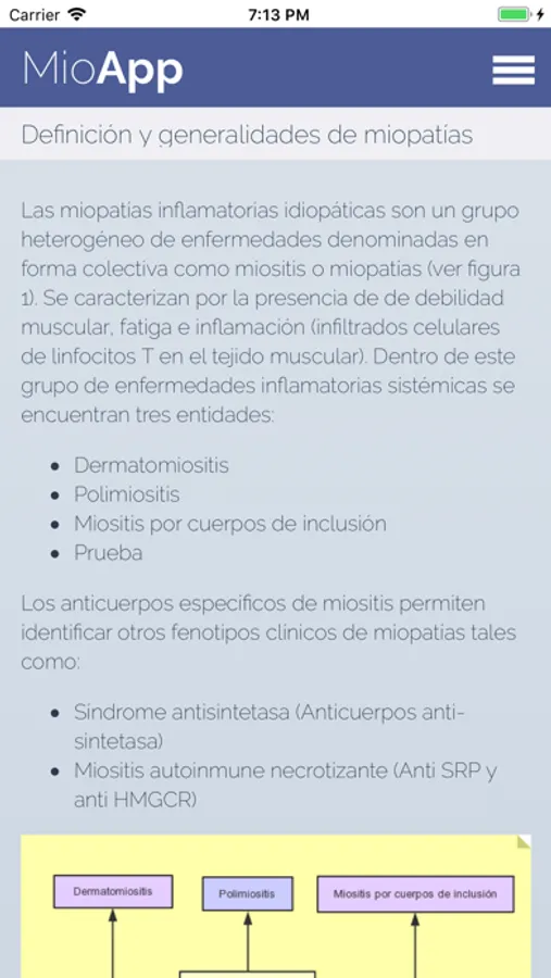 MioApp es una aplicación que incluye contenidos teóricos y calculadoras de diagnóstico y clinimetría de interés para el médico con respecto al tema de miopatías. La aplicación está dirigida a dirigida a médicos generales, especialistas en medicina interna, medicina familiar, fisiatras, neurólogos y reumatólogos.