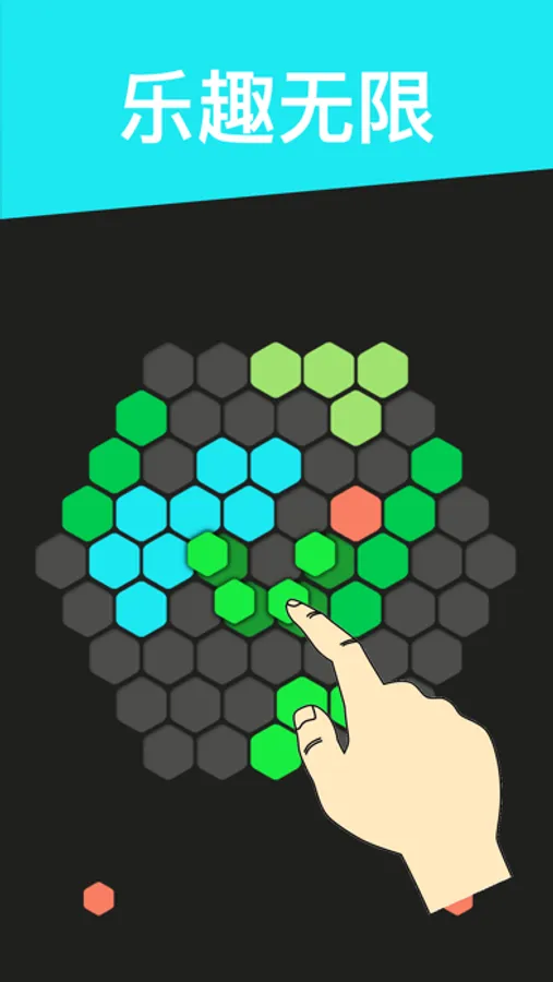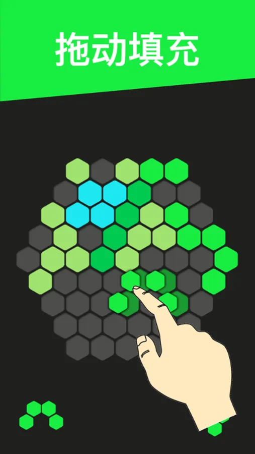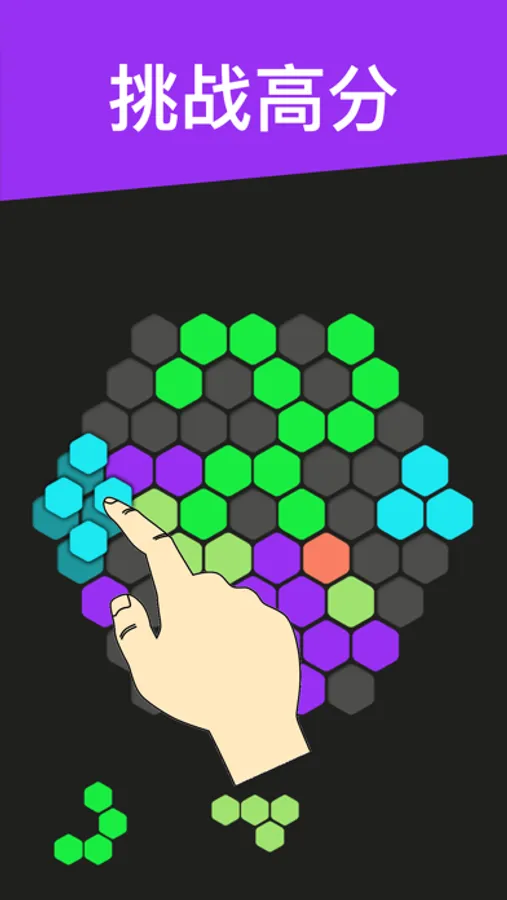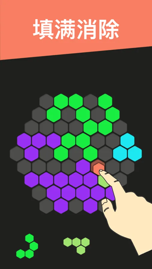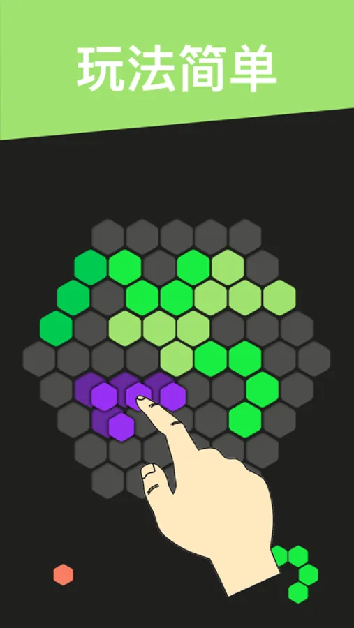 The gameplay is simple. After the game starts, use your finger to drag the six hexagonal blocks at the bottom to the empty spaces in the large hexagonal grid above to fill the blocks. Fill a row to eliminate and score points. When there is nowhere to place the hexagonal blocks, the game is over!