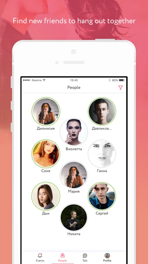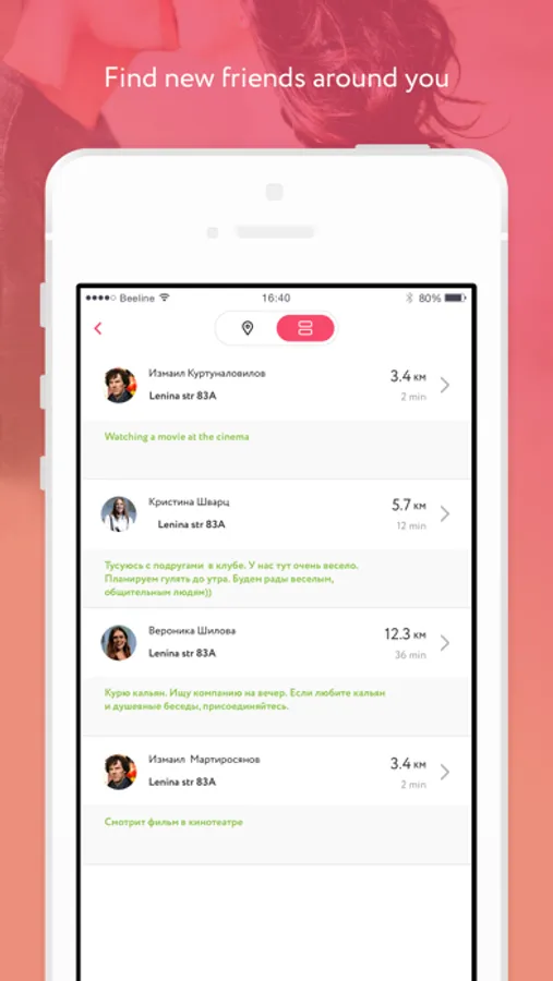 Meet new people at any convenient time. No more bulky screens with a lot of notifications: the simple and intuitive interface makes communication and searching for people much more pleasant and convenient.