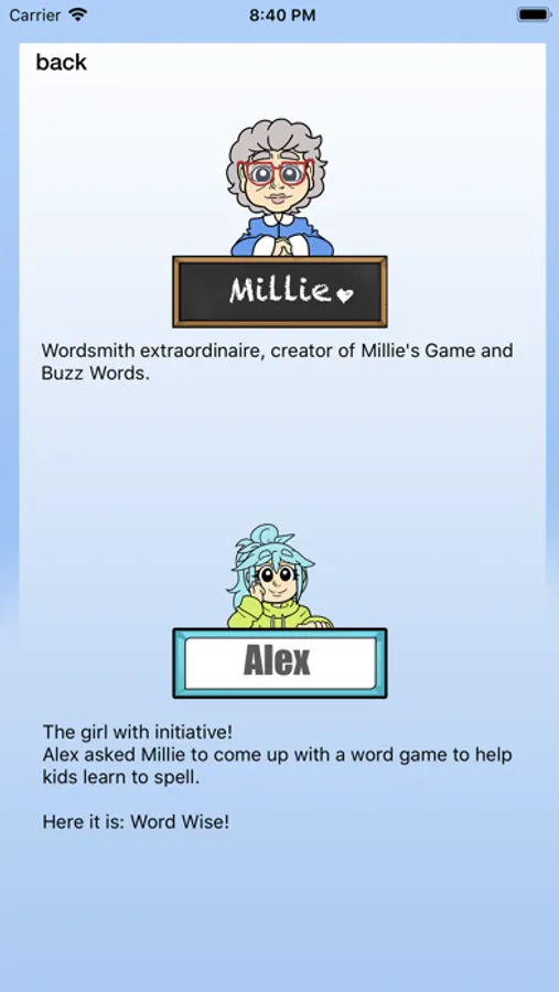 The game features Millie, the word wizard extraordinaire, and young Alex, who seeks to emulate her skill.