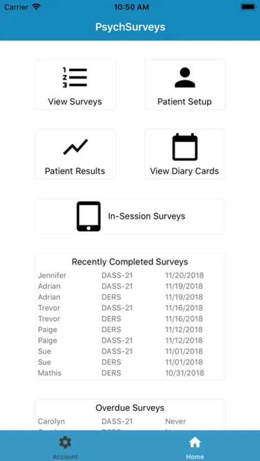 With PsychSurveys, patients do not need to email you their results from surveys and diary cards - the results are available to you in real-time automatically. In addition, setting up surveys and diary cards for patients is quick, simple, and centralized.