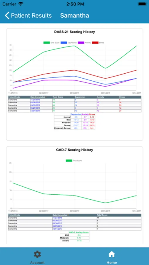 As surveys are completed, they are automatically scored. Each patient's progress is tracked over time for each applicable survey. The reports include all relevant scales and sub-scales and you can drill down to see how the patient responded to the questions in the surveys for each time they completed a survey.