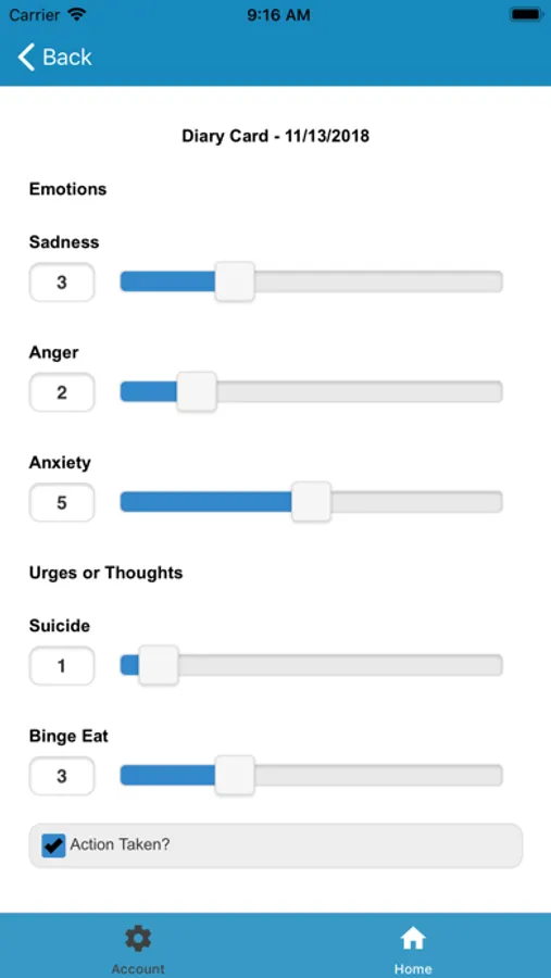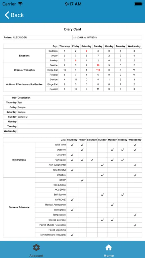 Diary Cards are a tool to help patients track emotions, urges, and behaviors on a daily basis. This aids clinicians in identifying their patients areas of struggle over the course of the week to more effectively prioritize session time and identify points for intervention. The diary card also functions as a tool for increasing awareness of emotions and urges for clients, as well as helping them identify Dialectical Behavior Therapy (DBT) skills they could use in moments of distress. When patients complete Diary Cards, the results are available for viewing instantly. There is no need for patients to email their diary cards to you each week. This feature is fully customizable and could be used as tracking sheets focusing on emotions, urges, and behaviors for Cognitive Behavior Therapy (CBT) based interventions as well.