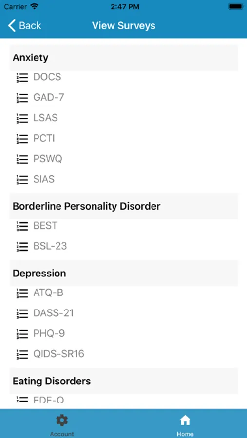 Simply choose which survey(s) you wish to have your patient(s) complete and how often. Patients can use either the mobile app for alerts and completion of surveys at home or while in session, or they can receive email alerts with links to complete surveys using a web browser on a PC or mobile device. Patients can opt out of the email alerts at any time simply by clicking the link in the email to opt out.