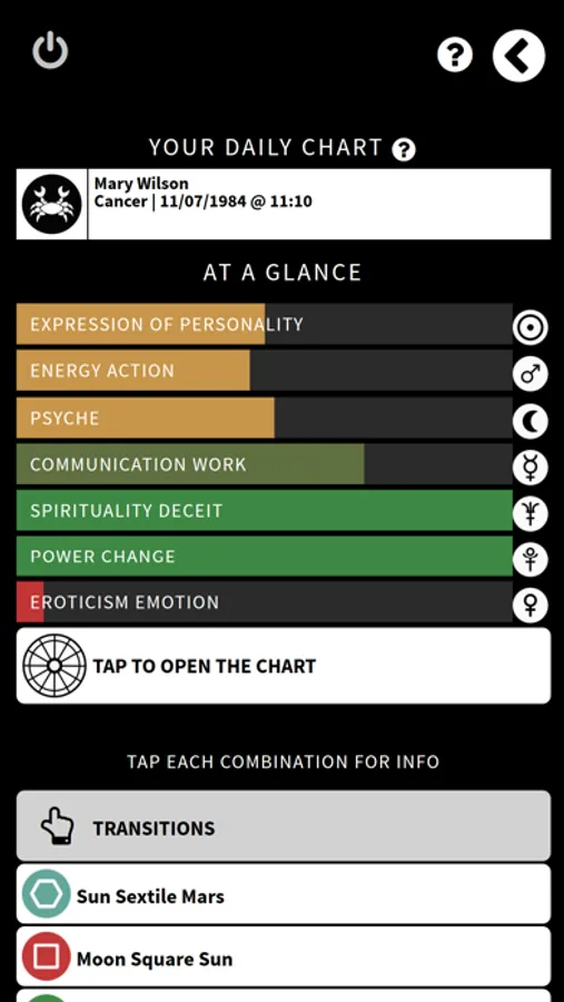 Example: You (that you where born July 10 in Alabama, at 8:25 AM and you are much more than just Cancer sign) have a date or a professional meeting in 3 hours. You are able to check the transitions for you for the specific moment and see how it will tend to go so you can be prepared!