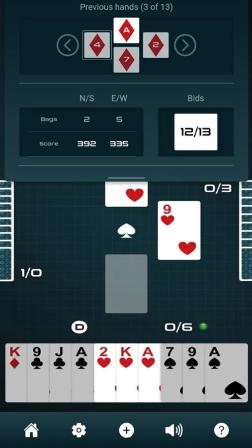 After the cards are dealt evenly between four players, each player bids on the number of tricks they think they can win. Follow suit if you can, or play any card in your hand, including a Spade, the Trump. No player can lead with a Spade until the first has been played – Spades are broken.
