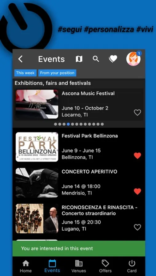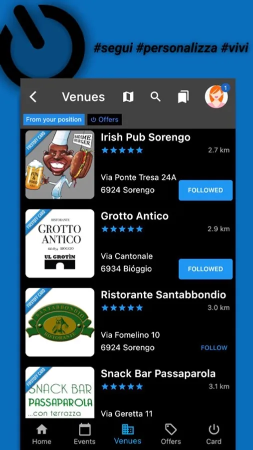 • Follow the venues you like the most, by activating the notifications you will see their new events, menus and offers in real time.