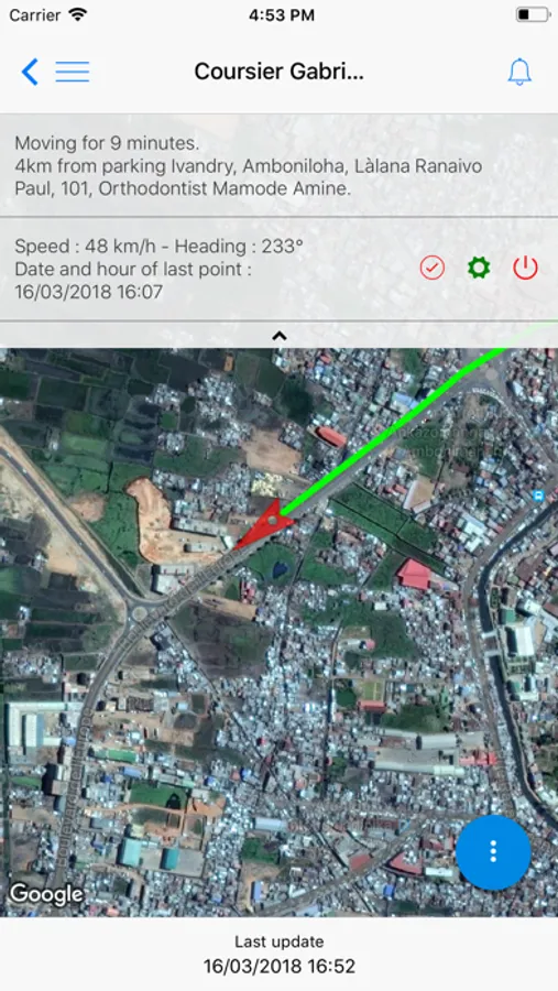 L'application affiche aussi les données suivantes : cap, statut du véhicule et adresses.