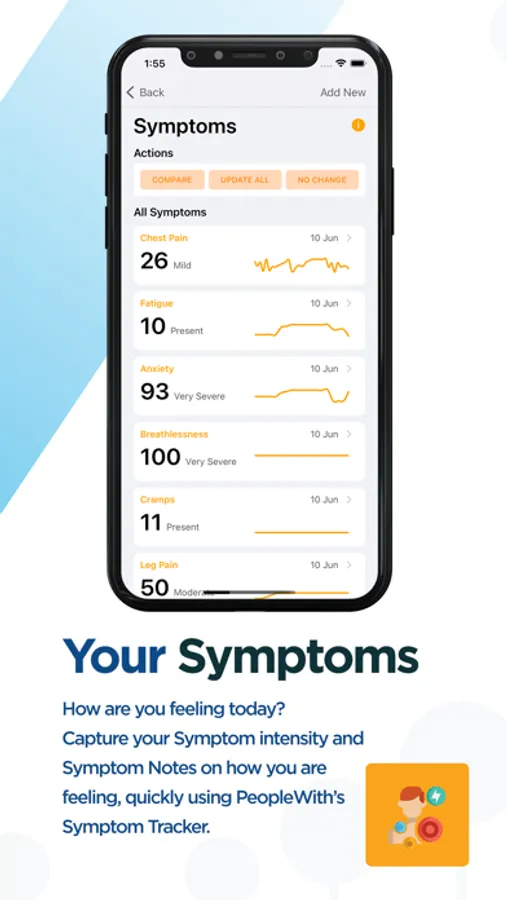 Capture your symptom intensity, what makes them better or worse, simply, everyday with the PeopleWith symptom tracker. Create evidence on your symptoms to present to your healthcare professional, to show how your health is progressing and enable them to determine if you are getting the best from your treatment.