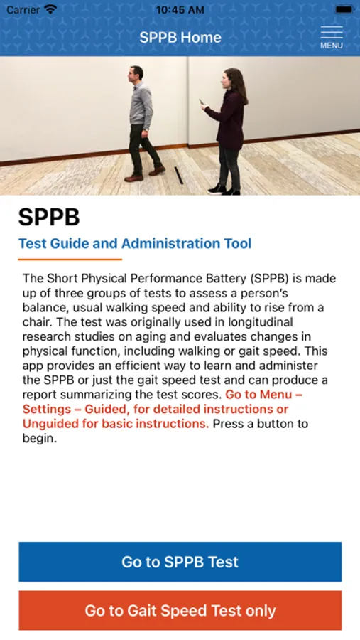 The SPPB Guide provides an efficient and reliable way to learn, administer and record the Short Physical Performance Battery (SPPB) and gait speed test for use in clinical care and research. The SPPB Guide standardizes test administration by providing complete guidelines for setting up and administering the tests, including course layout and an instructional script, and uses the stopwatch function of the phone to capture the needed data. The SPPB Guide algorithm calculates all scores and produces an electronic summary report in PDF and Excel formats that can be printed or emailed.