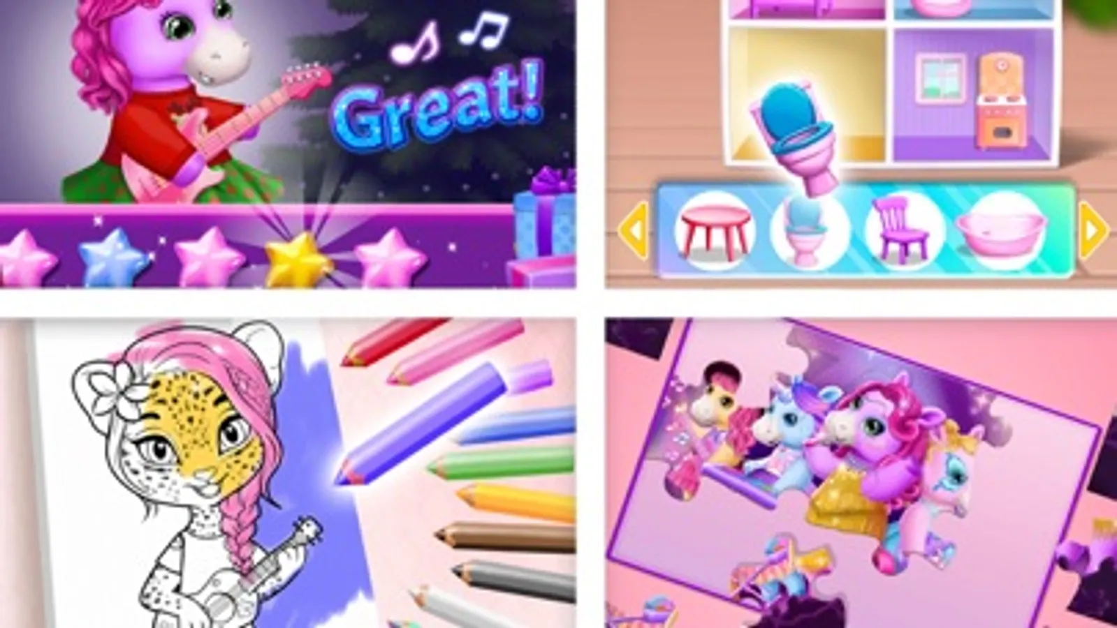 · Open all the gifts, decorate a doll house, do puzzles, color with pencils and more!