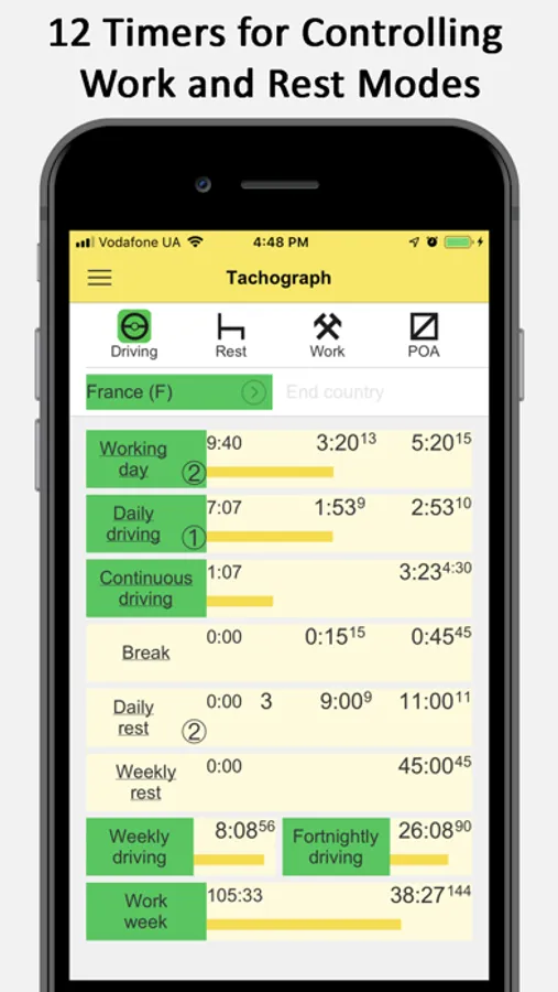 Just switch the modes of the app in accordance with what you are doing (Driving/Rest/Work/POA), and the app itself will start the necessary timers and show you all the necessary information.