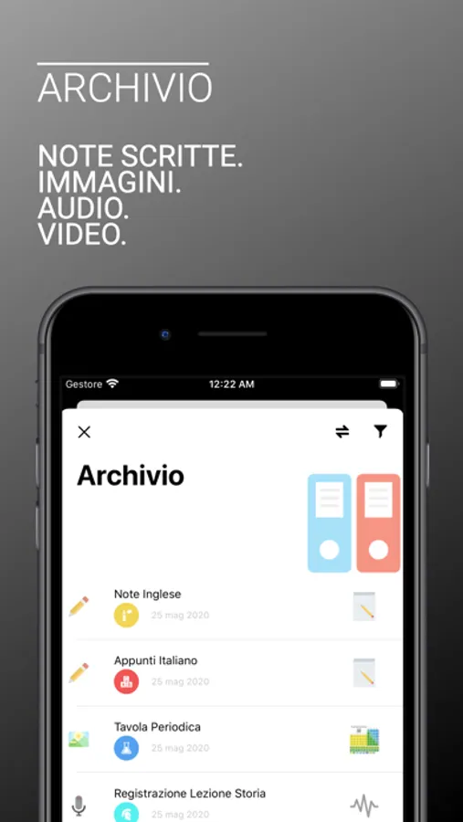 • Aggiungi note scritte, immagini, file audio e video; puoi decidere se assegnarle o meno a una materia specifica.