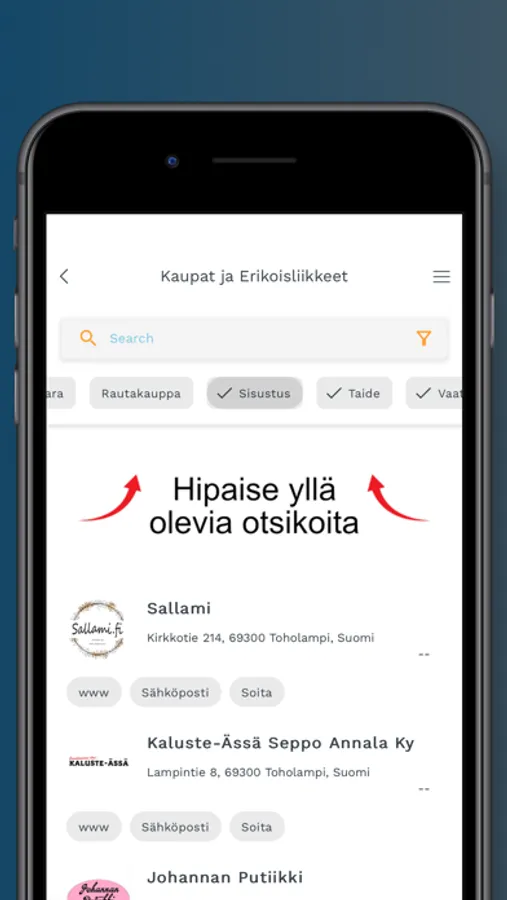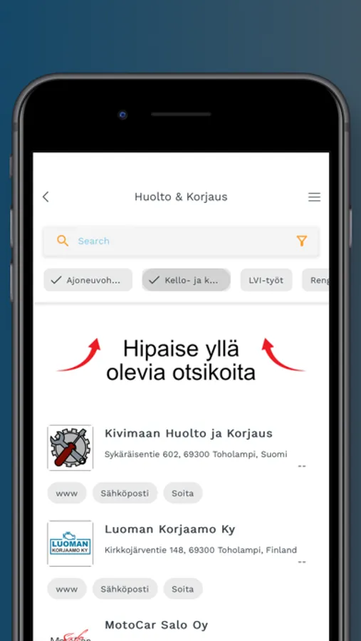 Sovelluksen avulla näet palveluiden sijainnit ja etäisyydet kartalla ja parilla hipaisulla voit aloittaa puhelun, sähköpostin tai navigoinnin haluamaasi kohteeseen. PUSH-viestit hyväksymällä voit myös vastaanottaa tiedotteita, viestejä ja hyödyllisiä uutisia!