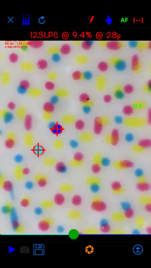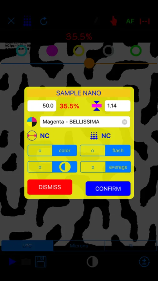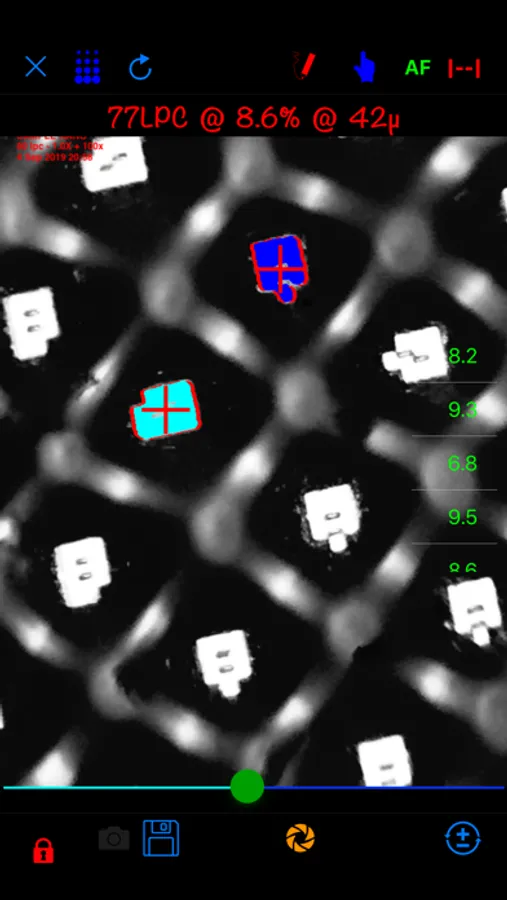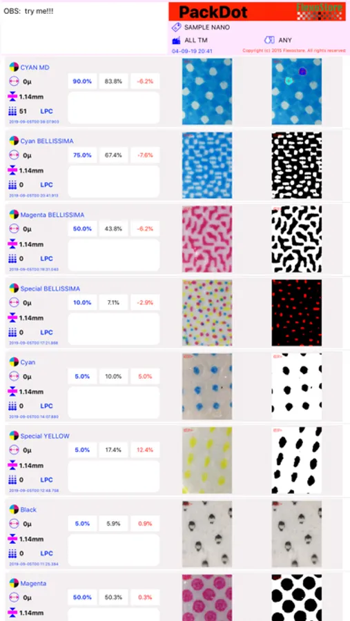 Measure the dots screen (LPC/LPI), the dot diameter and the area/ink percentual, just taking a photo coupling a metallurgical microscope or using a WIFI microscope.