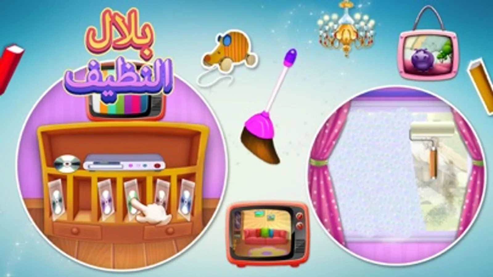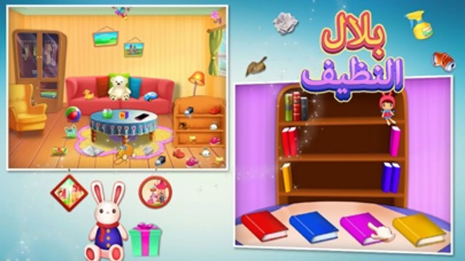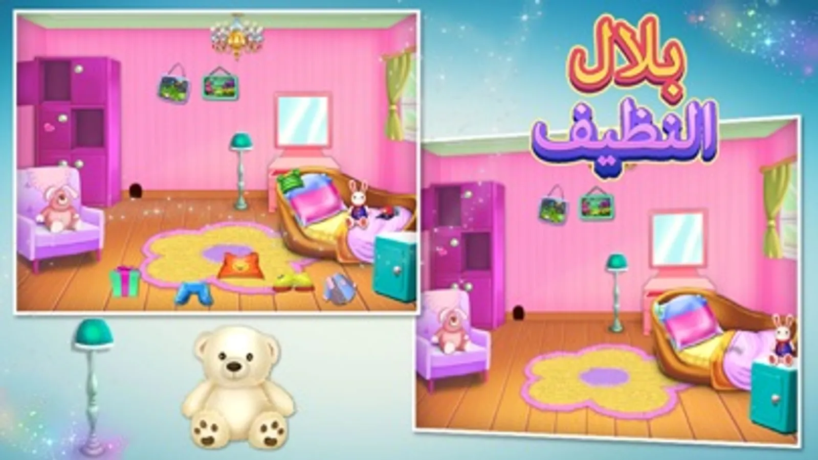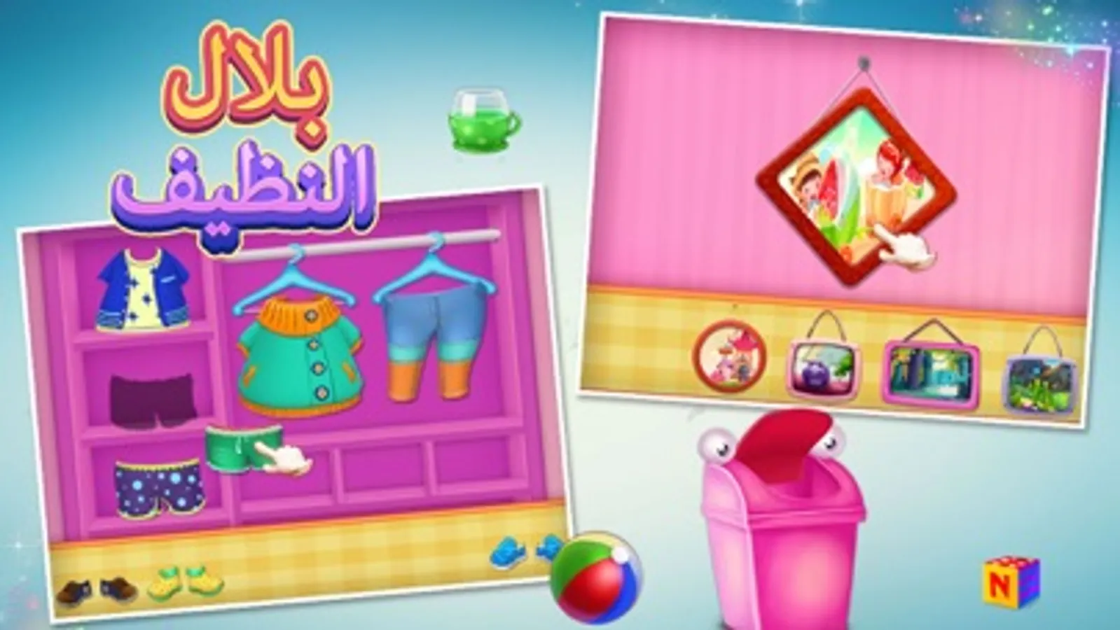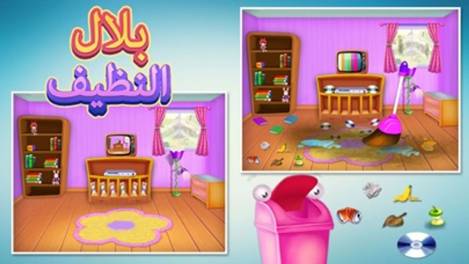 بالصوت واللغة العربية, هيا ننظف ونرتب الغرفة سويةَ, لعبة تعليمية مسلية تتضمن العديد من المهام المميزة. حيث يتوجب على الطفل المساعدة في العديد من المهام كالتقاط الاشيتء المبعثرة من الارضية وتنظيف المكان. بالاضافة الى مهام مطابقة الازواج من الملابس ووضعها في المكان المناسب. ترتيب الأقراص الليزرية والكتب المبعثرة