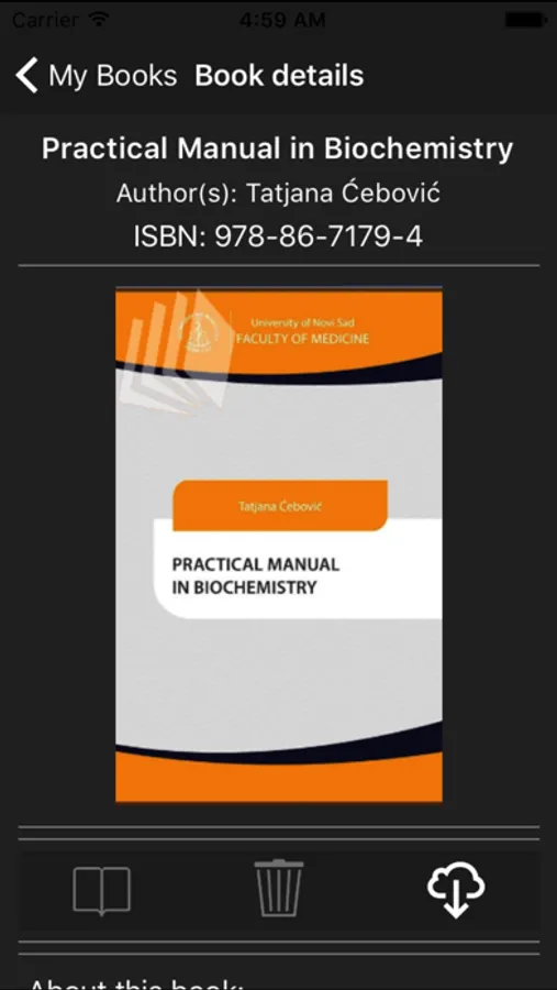 This is an application where students of Faculty of Medicine can view and read e-books related to their studies. Users can search available e-books, download them and read them offline at any time. If any book is not needed by the user it can be deleted from system at any time, with possibility to download it later at any time.