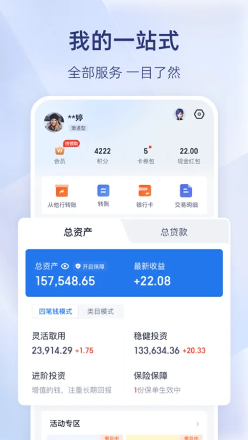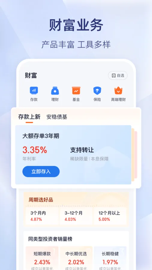 财富管理:严选优质投资产品,稳稳的幸福收益。多款灵活性强的存款产品,零钱也有大用处;