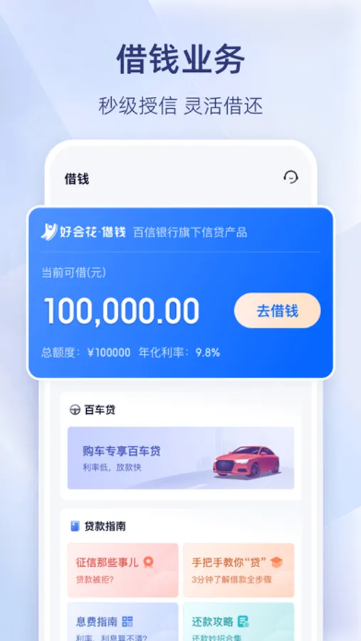 信贷借钱:全程在线快速审批,日息低至0.02%,提前还款无手续费,额度最高30万(以审批为准)。好生活,好会花;
