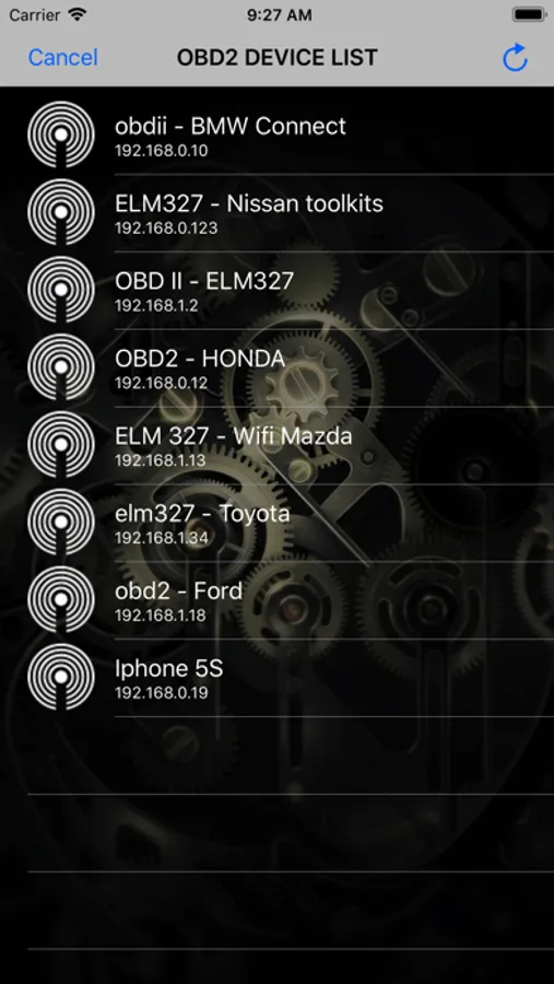 - Launch your Engine OBD App. Click "Settings" for scan list OBD2 device and select correct your OBD device for diagnostics. (default is 192.168.0.10 or 192.168.0.123)