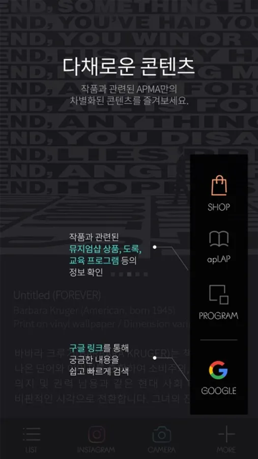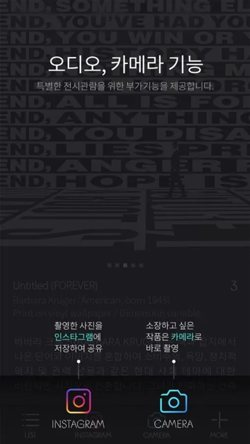 - APP 내 카메라 기능을 이용하여 전시 관람 중 자유롭게 사진 촬영이 가능합니다. 인스타그램 바로가기를 통해 편리하게 자신만의 사진을 업로드하여 다른 관람객들과 공유해 보세요.