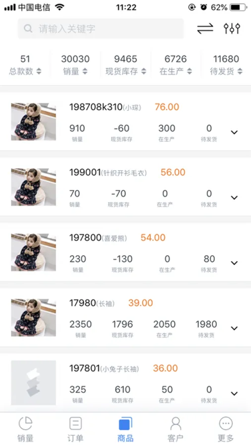 针对单款商品的尺码、颜色、销量、库存、盈利、欠货、受众等进行数据监控的同时,还可对所有商品进行筛选排名,帮助管理者对热销、滞销商品做出提前判断及决策;