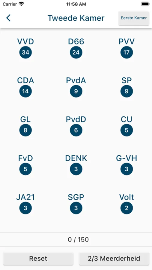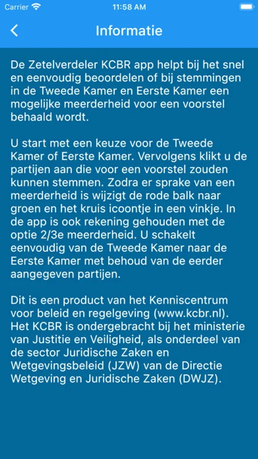 De Zetelverdeler KCBR app helpt bij het snel en eenvoudig beoordelen of bij stemmingen in de Tweede Kamer en Eerste Kamer een mogelijke meerderheid voor een voorstel behaald wordt.