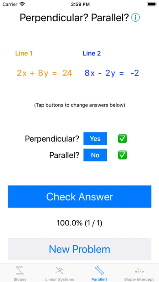 - recognizing whether two lines are parallel, perpendicular, or neither; and