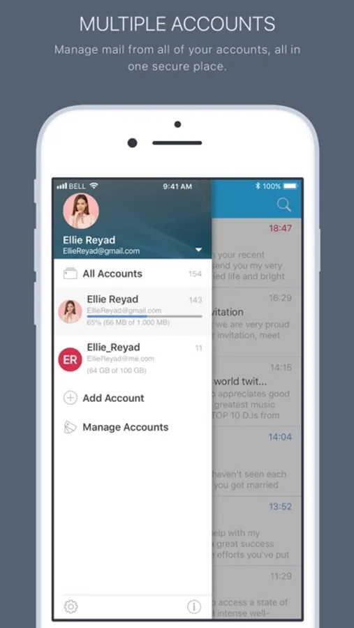 All Accounts in One – Manage emails from Gmail, Google Apps, Outlook, Office 360, Yahoo! Mail, AOL, iCloud or any other IMAP server.