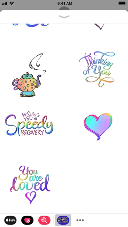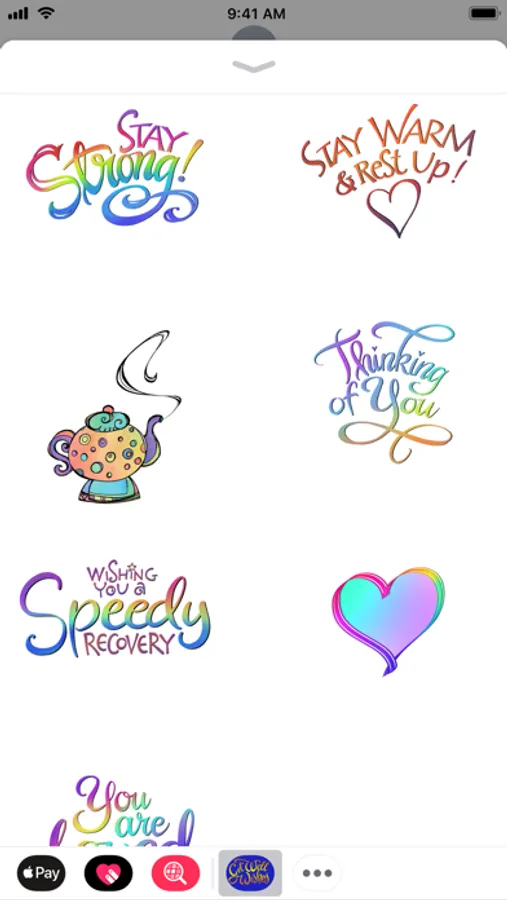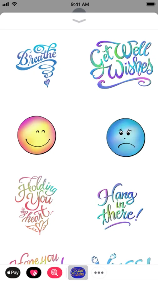 Turn your texts into a virtual hug with the Get Well Wishes collection of 25 heartfelt Care-Moji stickers. Designed and hand-lettered by world-renowned calligrapher Joanne Fink of Zenspirations®, these colorful sentiments and illustrations are a great way to brighten someone’s day.