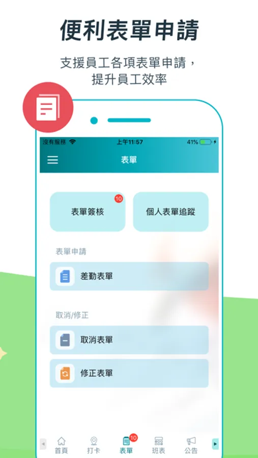 - 個人表單:介面直觀,可即時依據項目選擇申請單,不論請假、公出,刷卡異常申覆與換班,都能一鍵查詢表單申請進度,確保員工安排不出差錯。