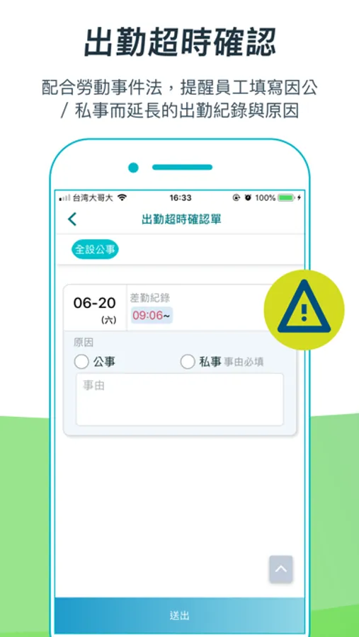 因應2020年台灣勞動事件法生效,系統提供員工超時確認單,讓員工可自行詳細記錄因公事 / 私事而增加工作時間的原因。勞檢時可快速整理資料應對。