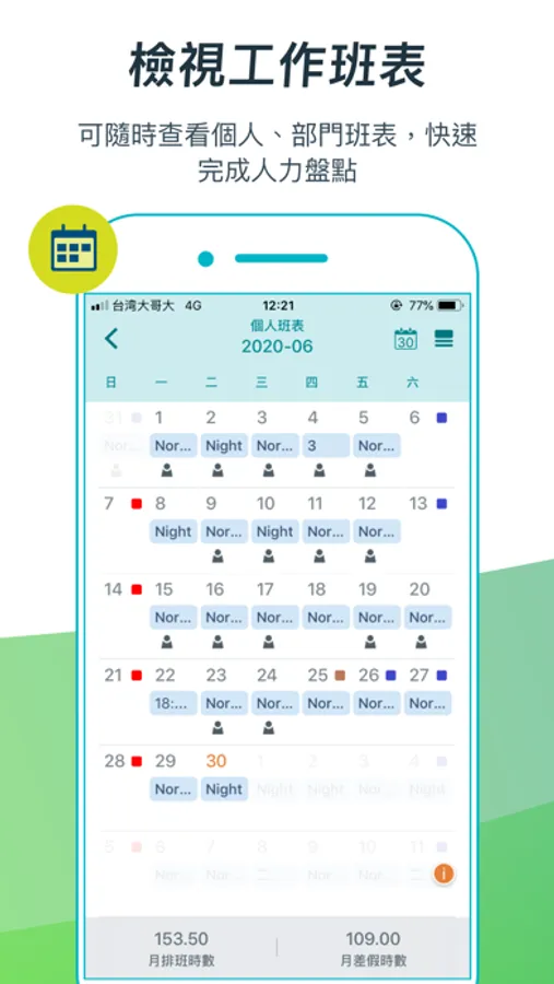 - 員工班表:清晰明瞭的個人、群組、部門排班顯示畫面,方便員工及主管查看班別(崗位),快速統計人力統計、差假時數。