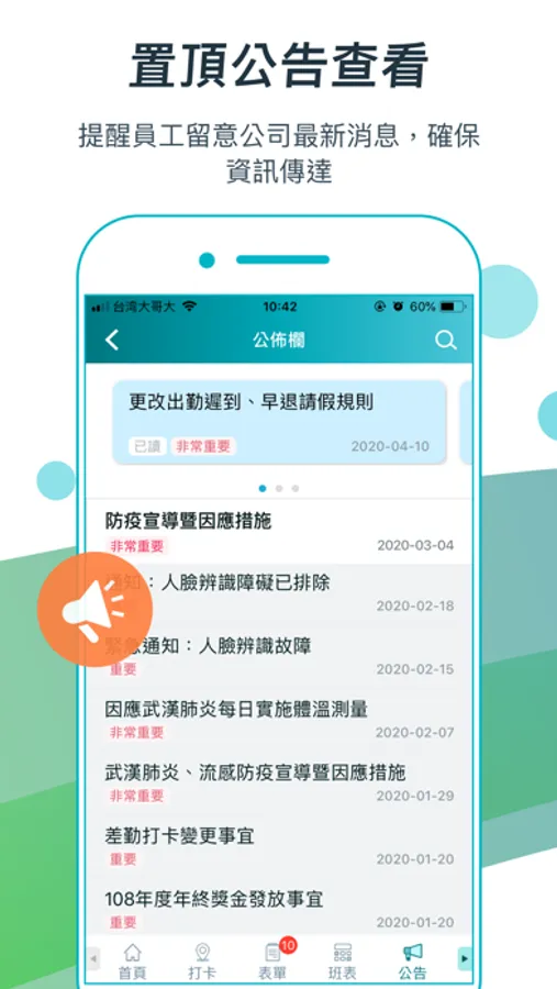 - 公告提醒:App上方顯示最新或公司置頂內容,確保每位員工知悉通知。員工可使用關鍵字篩選查看,色差顯示清楚標記已讀 / 未讀公告。