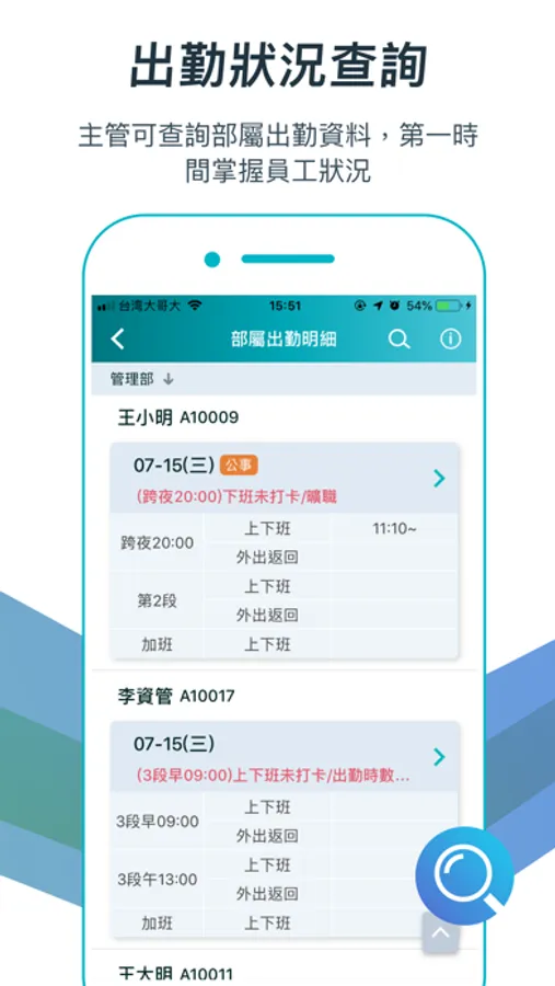 - 主管查詢:App提供部門主管查詢部屬出席狀況功能,不論內勤或是外勤員工,都能第一時間關懷,確保員工安危與進度追蹤。