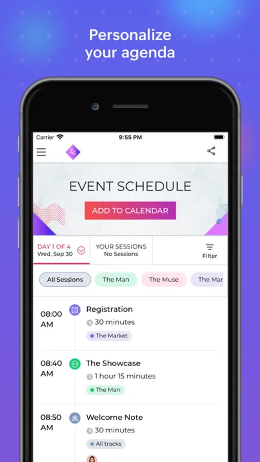 • Pick and choose sessions that interest you to create your own agenda for the event. Add sessions to your phone’s calendar to stay on top of your day.