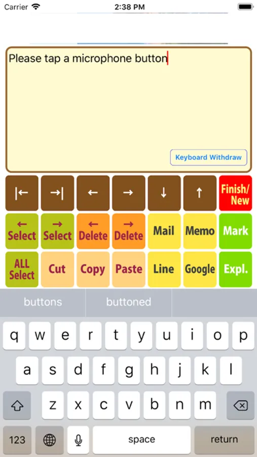 User of this editing app for Voice Input can edit sentences by using various function buttons such as moving cursor, selecting characters, deleting characters, copying and pasting characters, sending mails and other functions.