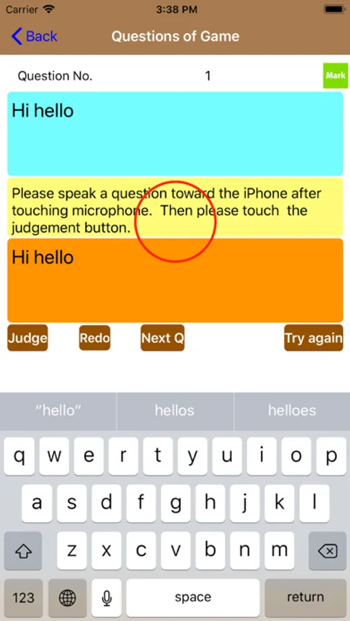 When users tap a “Judge” button, a circle mark will appear on the screen if the written sentences are equal to the same question. A cross mark will appear if the answer is not equal to the same question.