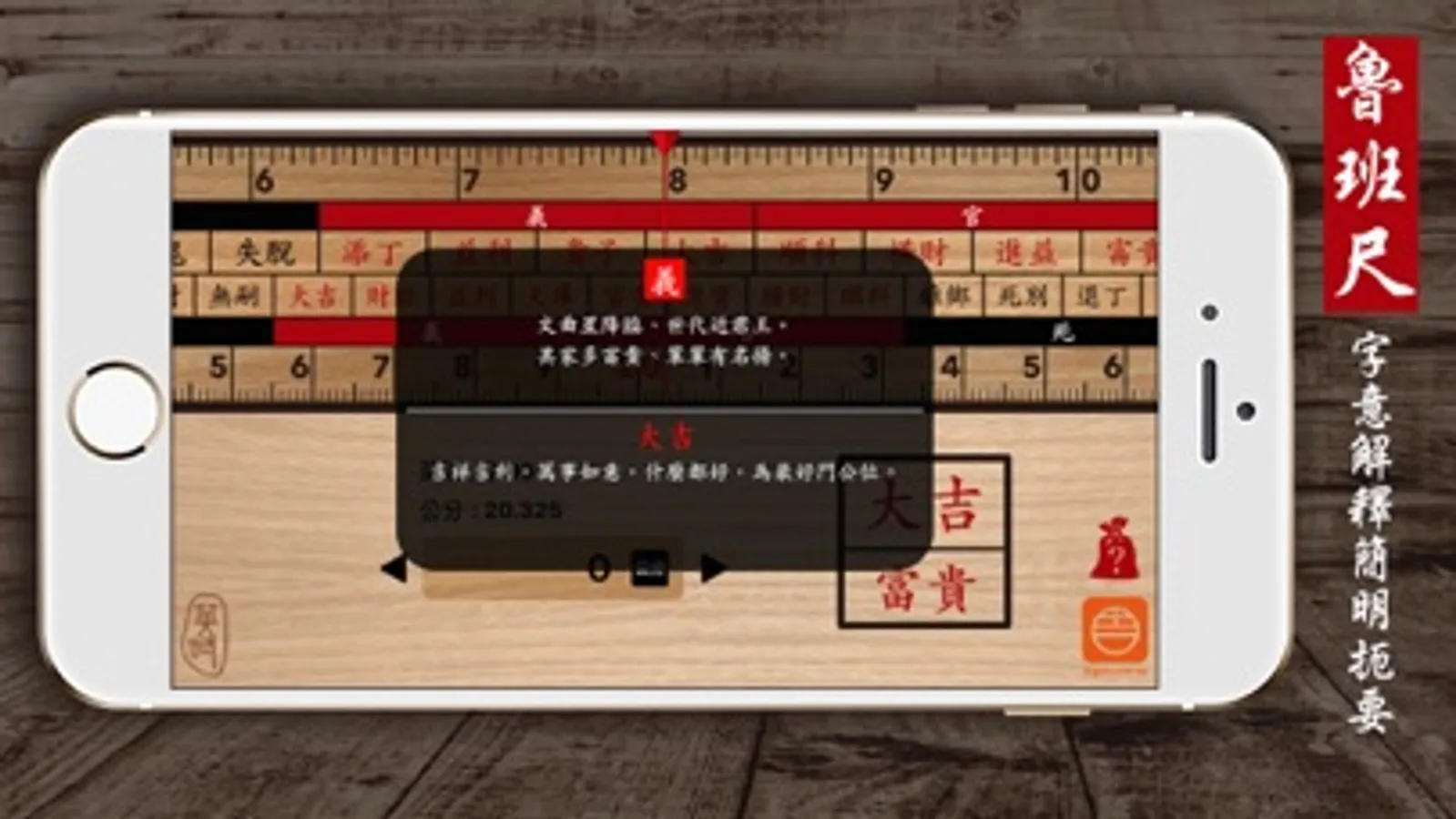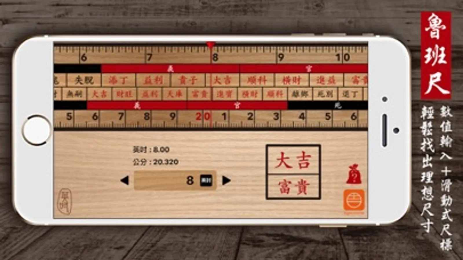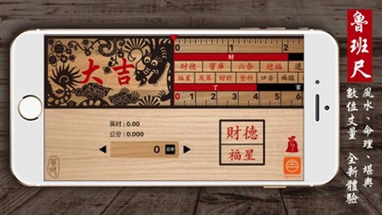 App讓傳統風水丈量更便利! 「魯班尺」又稱「魯般尺」通稱「文公尺」。長1.4142台尺,以生老病死苦五字為基礎,劃分為八格,各有凶吉,依序為:財、病、離、義、官、劫、害、本。風水尺又分為上下兩個部份:上半部為文公尺:用於陽宅、神位、佛具尺寸。下半部為丁蘭尺:多用於陰宅、祖龕。