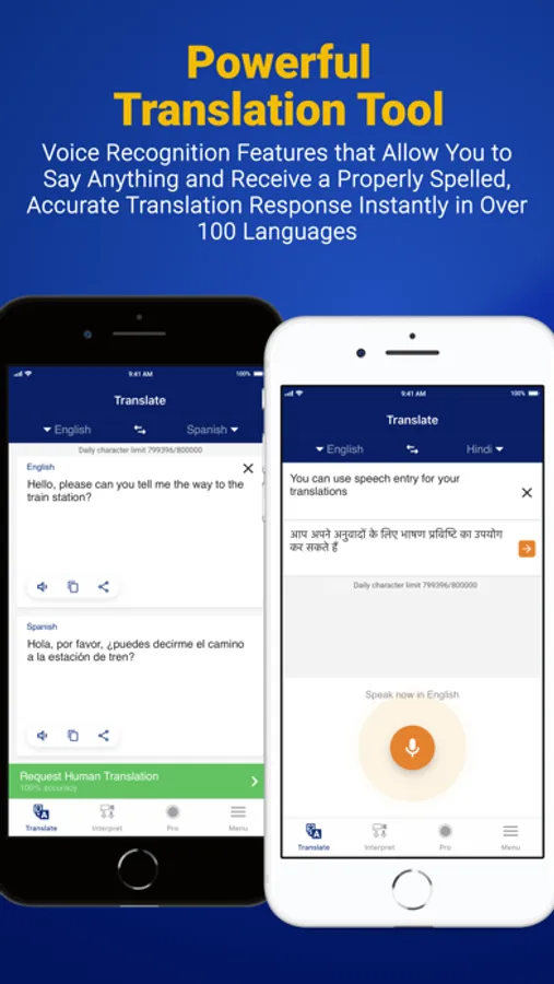If you need large bodies of text translated accurately within a moments notice, you can subscribe to one of our paid models that best suits your needs. Our app lets you translate up to 450 thousand characters per day for only 22 dollars per month.