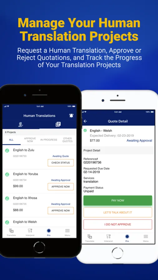 If you need professional Human-Powered Translations for documents or other files, you can order the translations directly from the app using the "Pro" feature. Our app lets you sign up or login within seconds through our “Pro” button so that you may order you're a professional human powered translation in a wide variety of file formats.