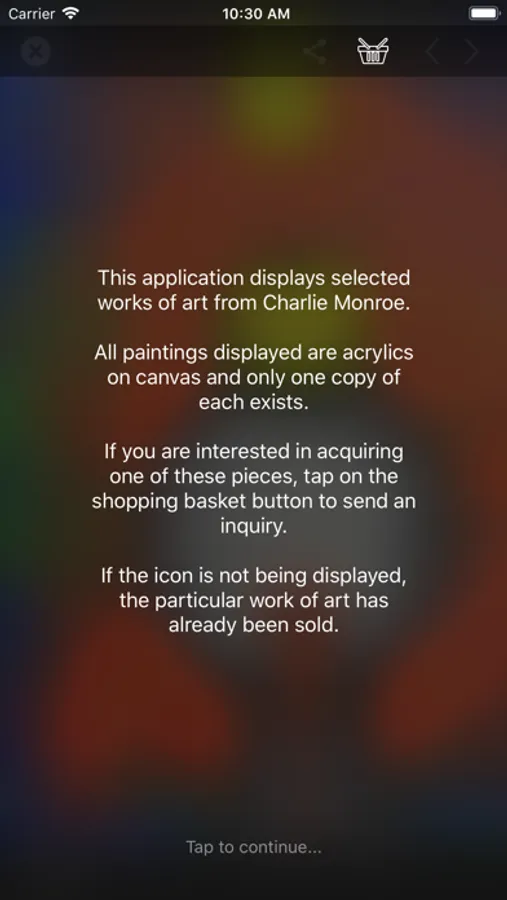 Over 60 paintings were selected to be presented via this app. View the paintings, share them, send iquiry about availability if interested.