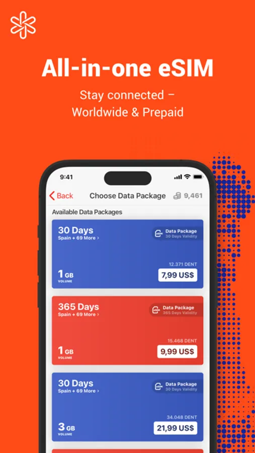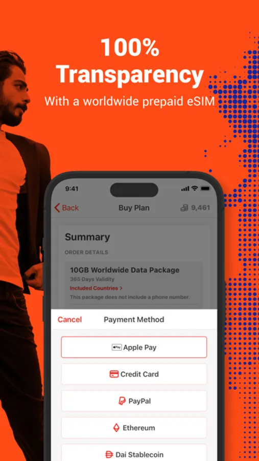 Buy DENTs securely and directly in the app and exchange them for eSIM data or voice minutes. We support various payment methods, like Apple Pay, PayPal, credit card, ETH, and many more!