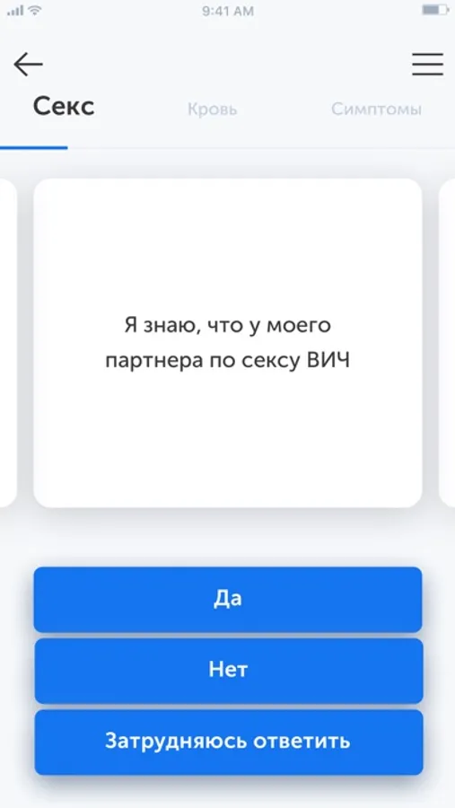 Приложение не ставит диагноз и не определяет наличие вируса в крови. Ваши ответы могут использоваться только в обобщенном виде для разработки программ, направленных на преодоление эпидемии.