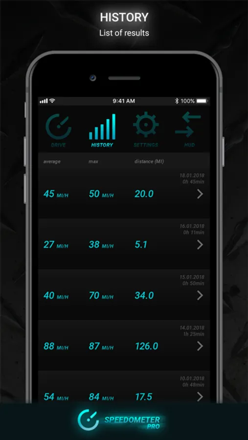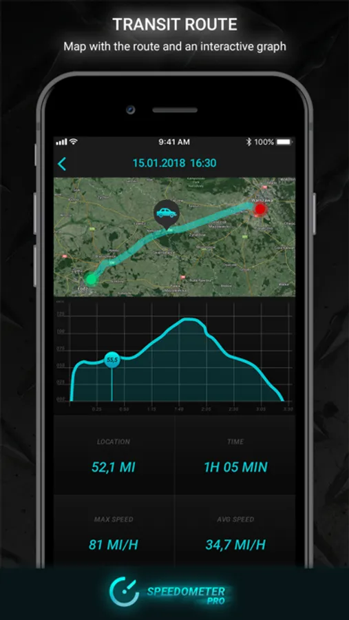 The Speedometer PRO automatically saves data on. The maximum and average speed, distance traveled and route. The interactive graph clearly shows the ratio of speed to time. All data are arranged chronologically and can be managed in the speedometer.