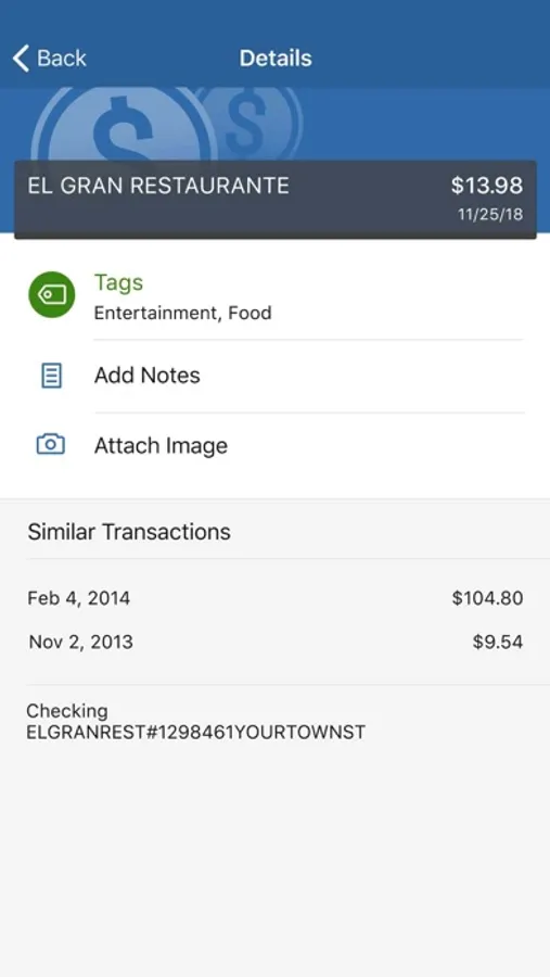 Add Tags, Notes, Images & Geo-Information: By enhancing transactions with custom tags, notes or photos of a receipt or check, you have the ability to stay organized and find exactly what you're looking for when searching through your finances.